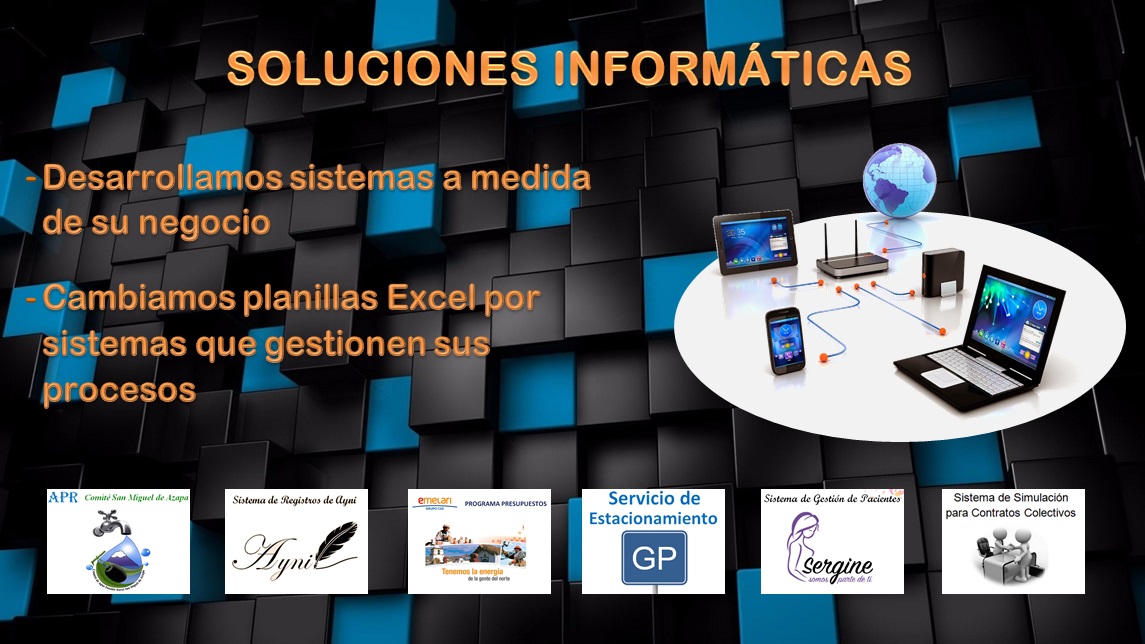 Bit Soluciones Informáticas es un grupo de trabajo que entrega soluciones integrales en el rubro de las tecnologías de la información y comunicación, dedicada al desarrollo de sistemas informáticos, diseño web, soporte informático, redes y asesorías en general para pequeñas y medianas empresas. Contamos con un equipo joven y multidisciplinario, dispuesto a llegar donde las necesidades de nuestros clientes lo requieran, bajo una política de excelencia y calidad.